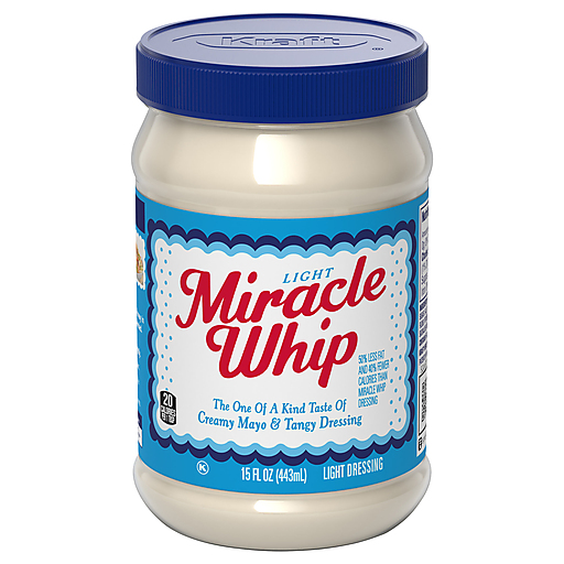 Miracle Whip Light Mayo-like Dressing adds a cool, zesty flavor to almost anything. Bursting with tangy vinegar and a medley of spices, our family favorite dressing and condiment delivers creamy texture and delicious flavor in every bite. As a spread similar-tasting to mayonnaise, light Miracle Whip is known for kicking sandwiches up a notch. Try out this versatile ingredient that can be used to make tangy salad dressings and even chocolate cakes for a finger-licking adventure. Our Light Miracle Whip contains fewer calories and fat than Kraft Mayonnaise. This product contains 20 calories and 1.5g fat per serving, Kraft Mayonnaise contains 90 calories and 10g fat per serving. Try light Miracle Whip for sandwiches and salads, in your favorite chicken recipe or as a creamy burger sauce. It also makes a tasty secret ingredient in deviled eggs and potato salad. Each jar should be stored in the refrigerator after opening.